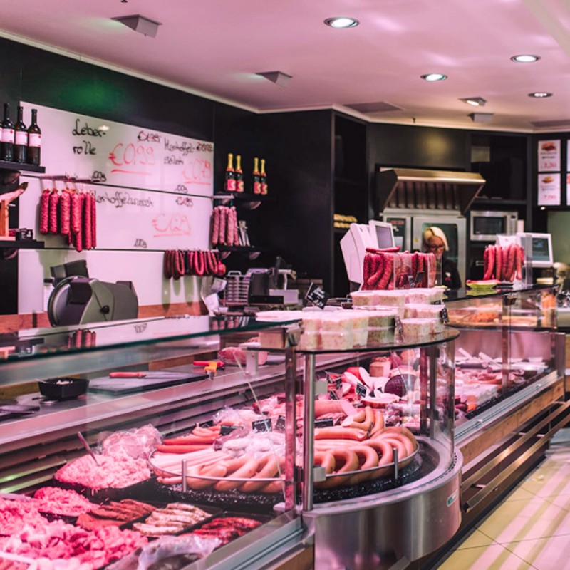 Proyecto de iluminación LED de carnicería, luz rosada con downlights LED.